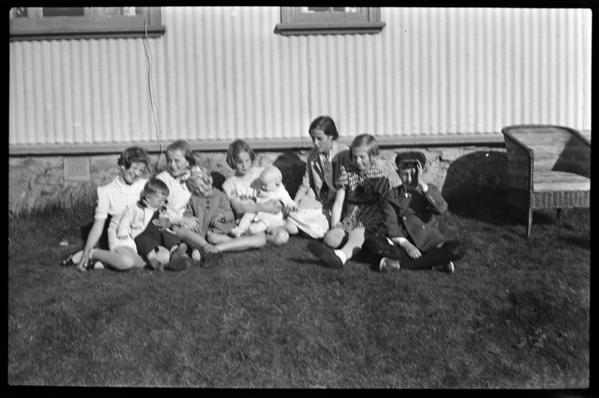 Hópur barna situr undir húsvegg. Afkomendur og tengdabörn Jakobínu Sigurveigu Guðmundsdóttur (1887-1967) og Jóns Björnssonar (1887-1949).