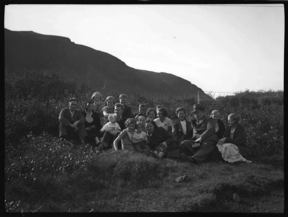 Hópur fólks utandyra. Hjónin Jón og Jakobína þriðju og fjórðu frá hægri. Eitthvað af börnum og barnabörnum þeirra eru á myndinni.