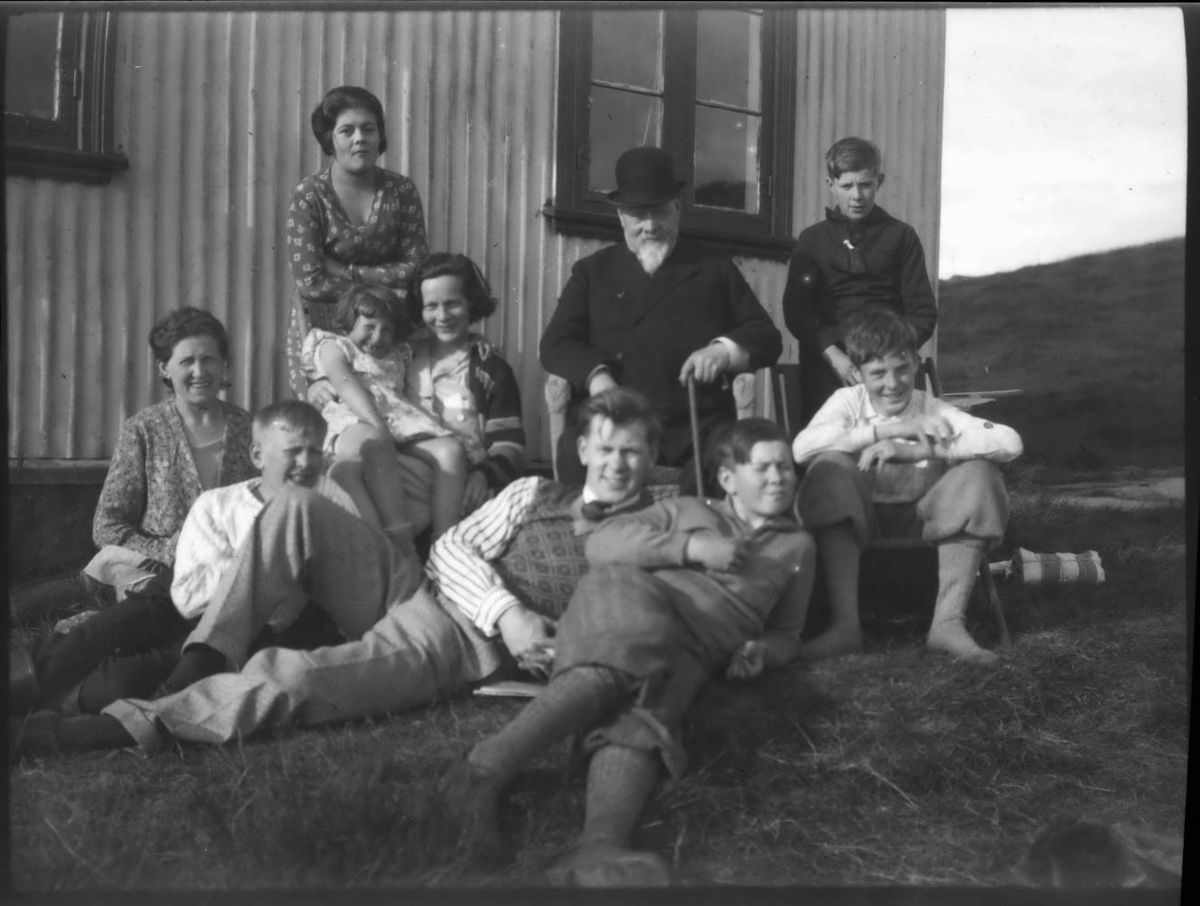 Hópur fólks, fullorðnir og börn undir húsvegg. Sama myndefni og mynd nr. 11. Jakobína eiginkona Jóns lengst til vinstri. Væntanlega allir fimm synir Jóns. Sigþrúður yngsta dóttirin situr í fangi á konu sem gæti verið Nanna.