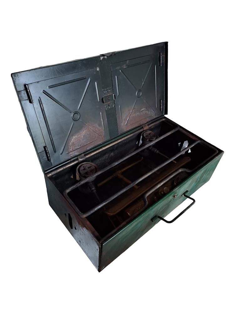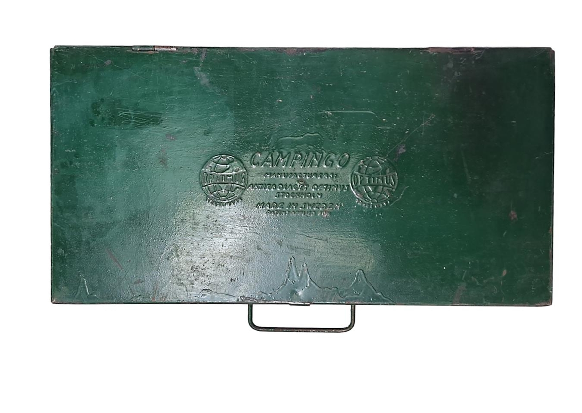 Er í upprunalegum umbúðum sem er málmkassi. Fylgihlutir fyrir prímusinn fylgja með. Sagður vera frá því um 1940.