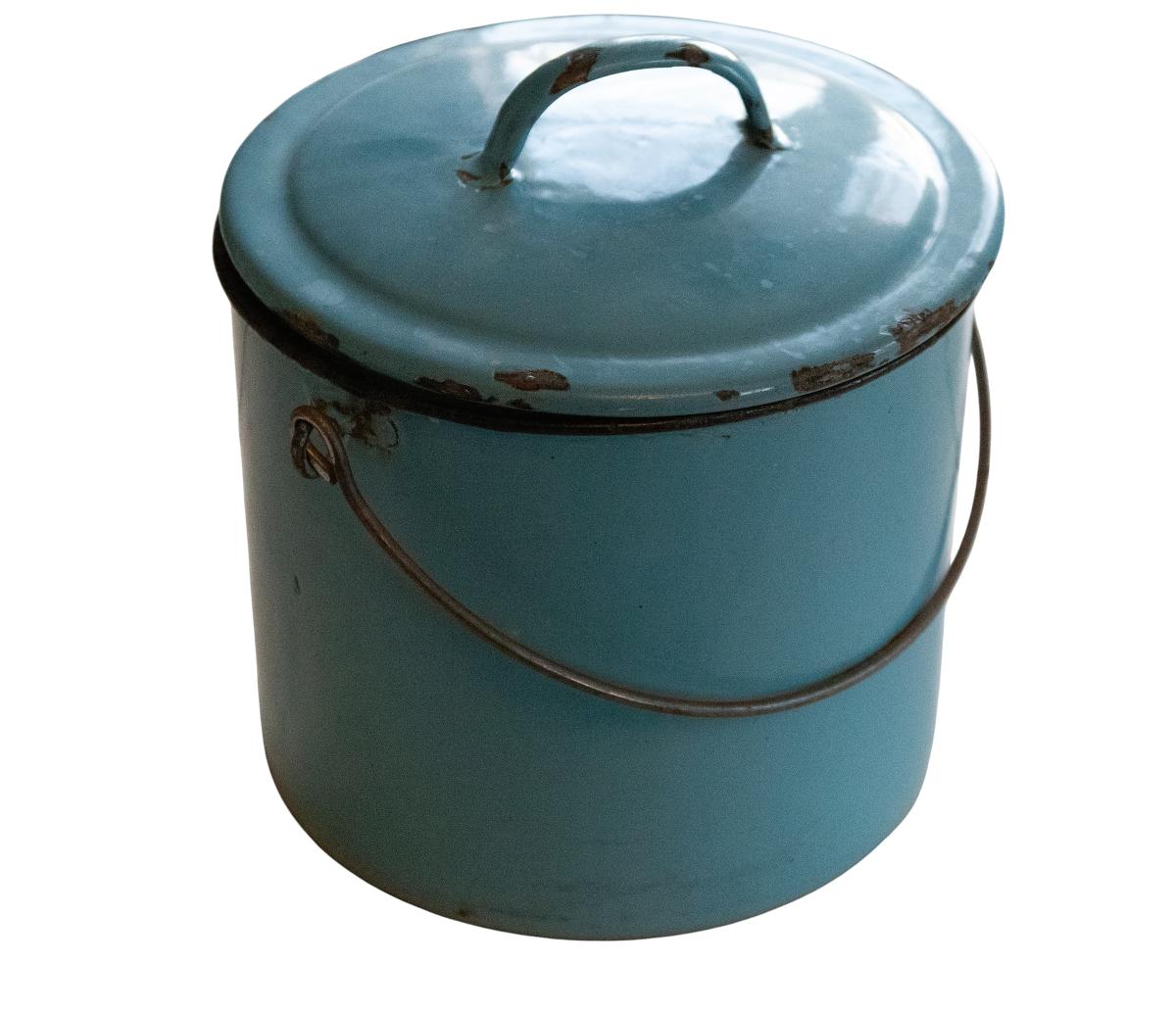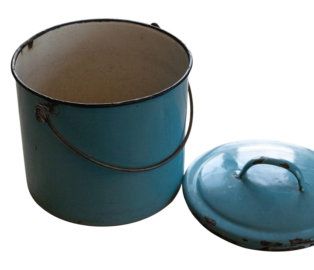 Emanlerðaur pottur, blár að utan og hvítur að innan, loki. 19 sm í þvermál og 21 sm hár. Kemur úr dánarbúi Valgerðar og Þórodds á Bekansstöðum