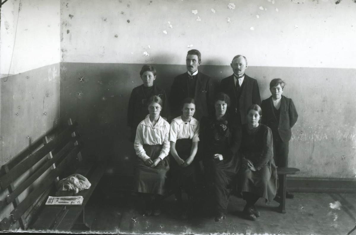 Barnaskólinn í Vík 1920, fullnaðarpróf. Hópmynd af nemendum og kennurum í Vík í Mýrdal. Sigurjón Kjartansson kennari og Jón Ólafsson kennari eru fyrir miðju í aftari röð en Gulaug Halldórsdóttir kennari er önnur frá hægri í fremri röð. Nemendurnir 5 eru óþekktir.