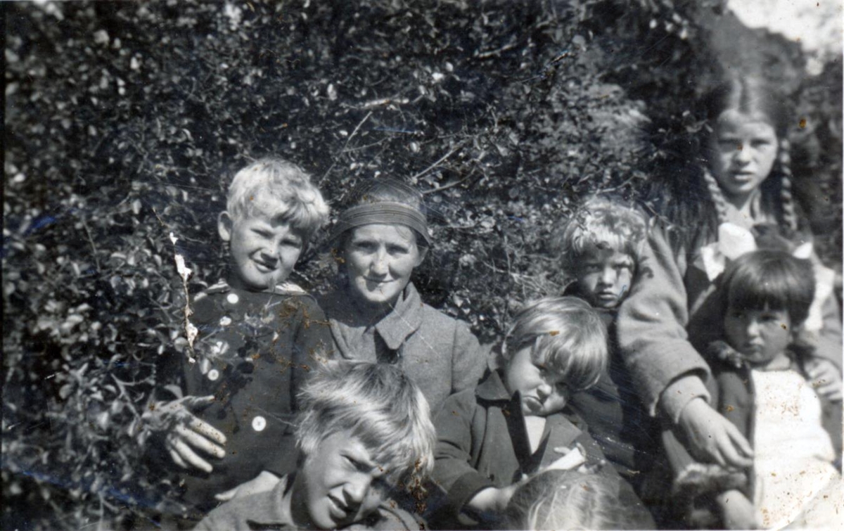 Á Blettunum í júní 1928, frá vinstri: Kjartan, Gauja, Bergur Sigurðsson, Einar, Þorkell Sigurðsson, Oddný Bergsdóttur, Sigrún, sést í kollinn á Ragnheiði Sigurðsdóttur