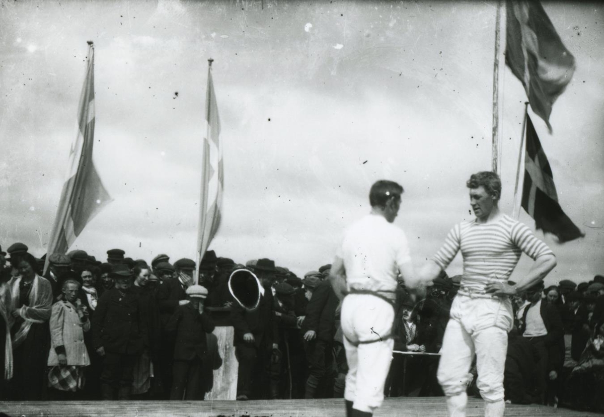Glímumenn á palli á íþróttamóti í Heiðardal í Mýrdal. Haraldur Einarsson th. Sá til vinstri er óþekktur.