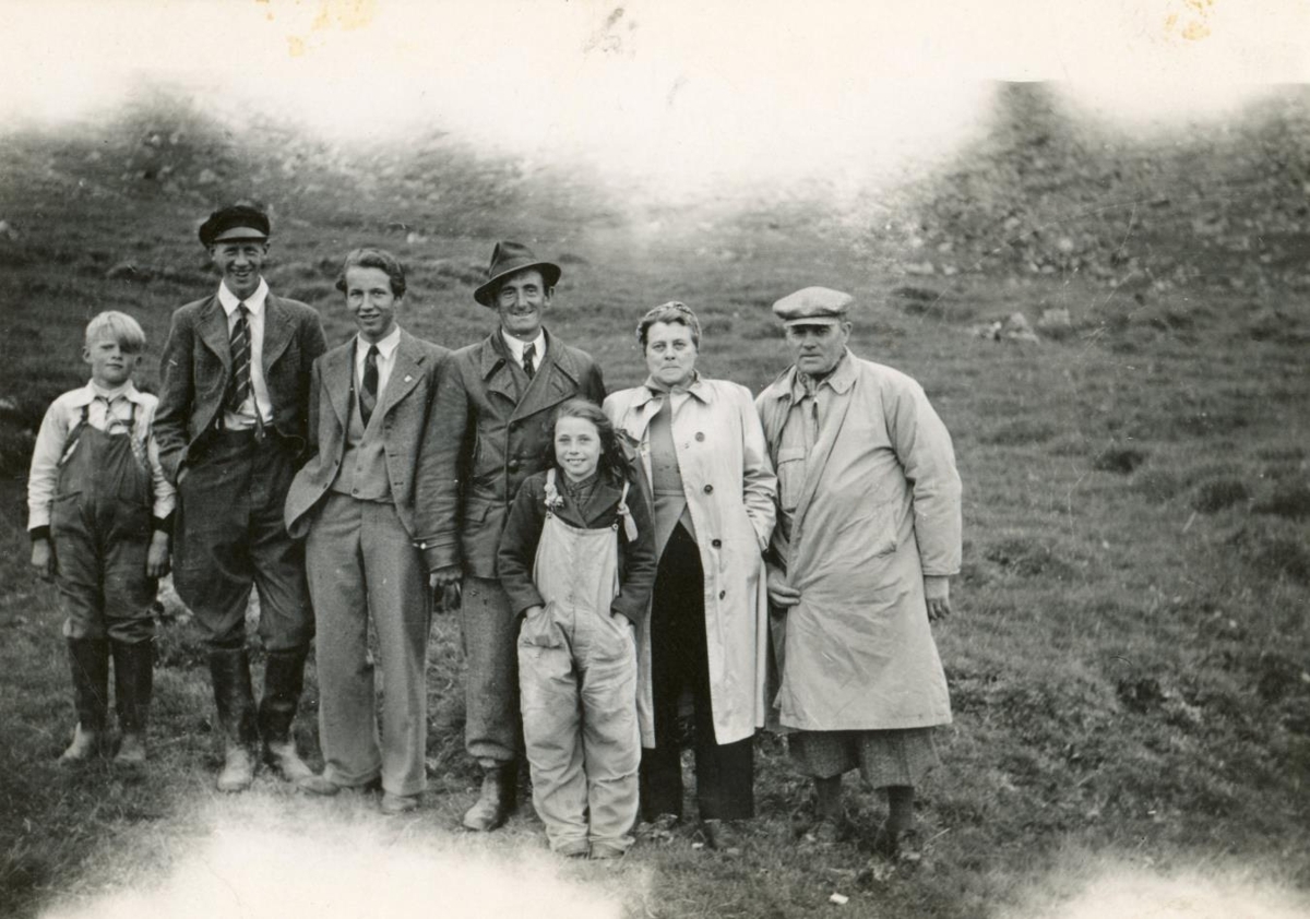 Frá vinstri. Óþekktur drengur, Gunnar Valdimarsson á Hnúki, óþekkt, Jóhannes Sigurðsson bóndi á Hnúki, Elsa Kjartansdóttir á Hnúki, óþekkt og óþekkt.