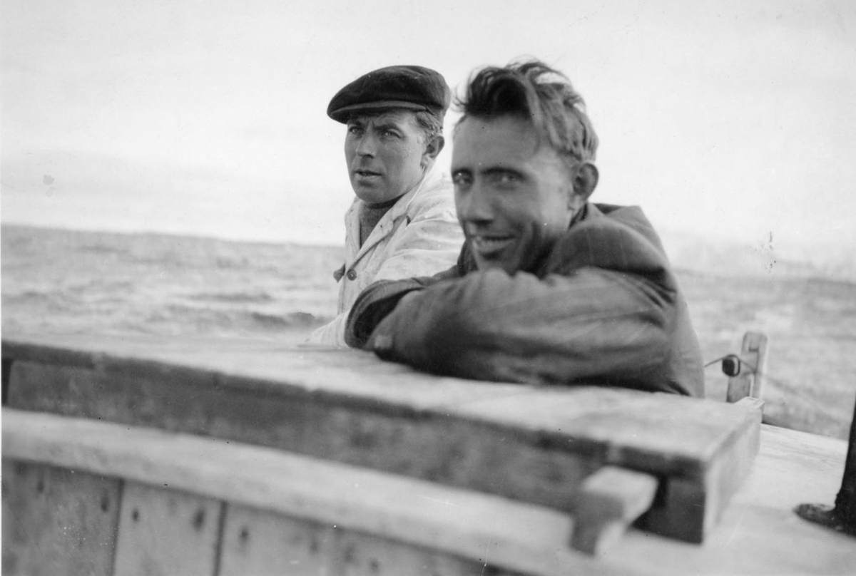 Frá vinstri. Hermann Kristinn Guðmundsson (1915-1978) frá Tindum og Eggert Björnsson (1915-2004) úr Arney, síðar búsettir í Stykkishólmi. Líklegast á Blika bát bræðranna Hermanns og Kjartans Guðmundssona frá Tindum.