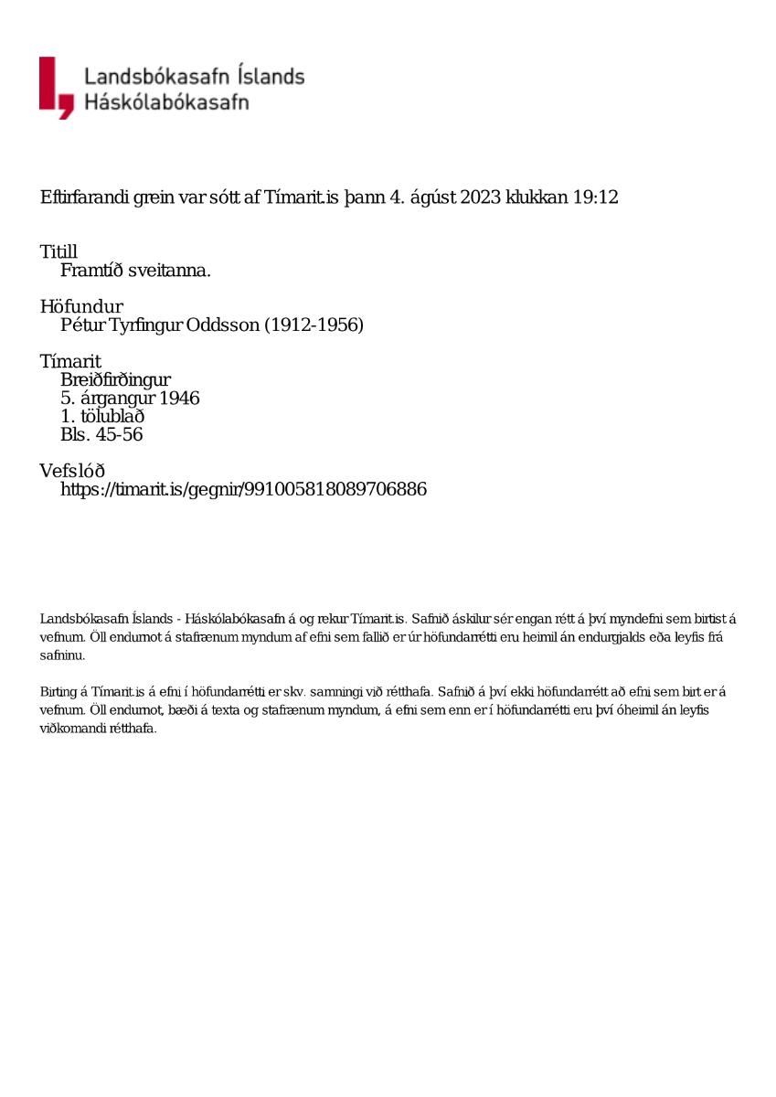 Pétur T. Oddsson. 1946. Framtíð sveitanna. Breiðfirðingur 5. árg. Bls. 45-56.