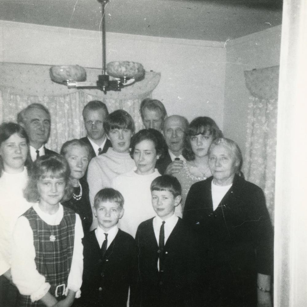 Aftari röð frá vinstri. Kristín Gunnarsdóttir á Hnúki II, Jóhannes Sigurðsson bóndi Hnúki, Kristín Teitsdóttir ljósmóðir á Hnúki, Þorsteinn G. Guðmundsson frá Barmi á Skarðsströnd, Erla Þórisdóttir á Hnúki, Elsa Kjartansdóttir og Gunnar Valdimarsson bóndi á Hnúki II, Kjartan Eggertsson bóndi í Fremri-Langey og Unnur Baldursdóttir á Ormsstöðum.