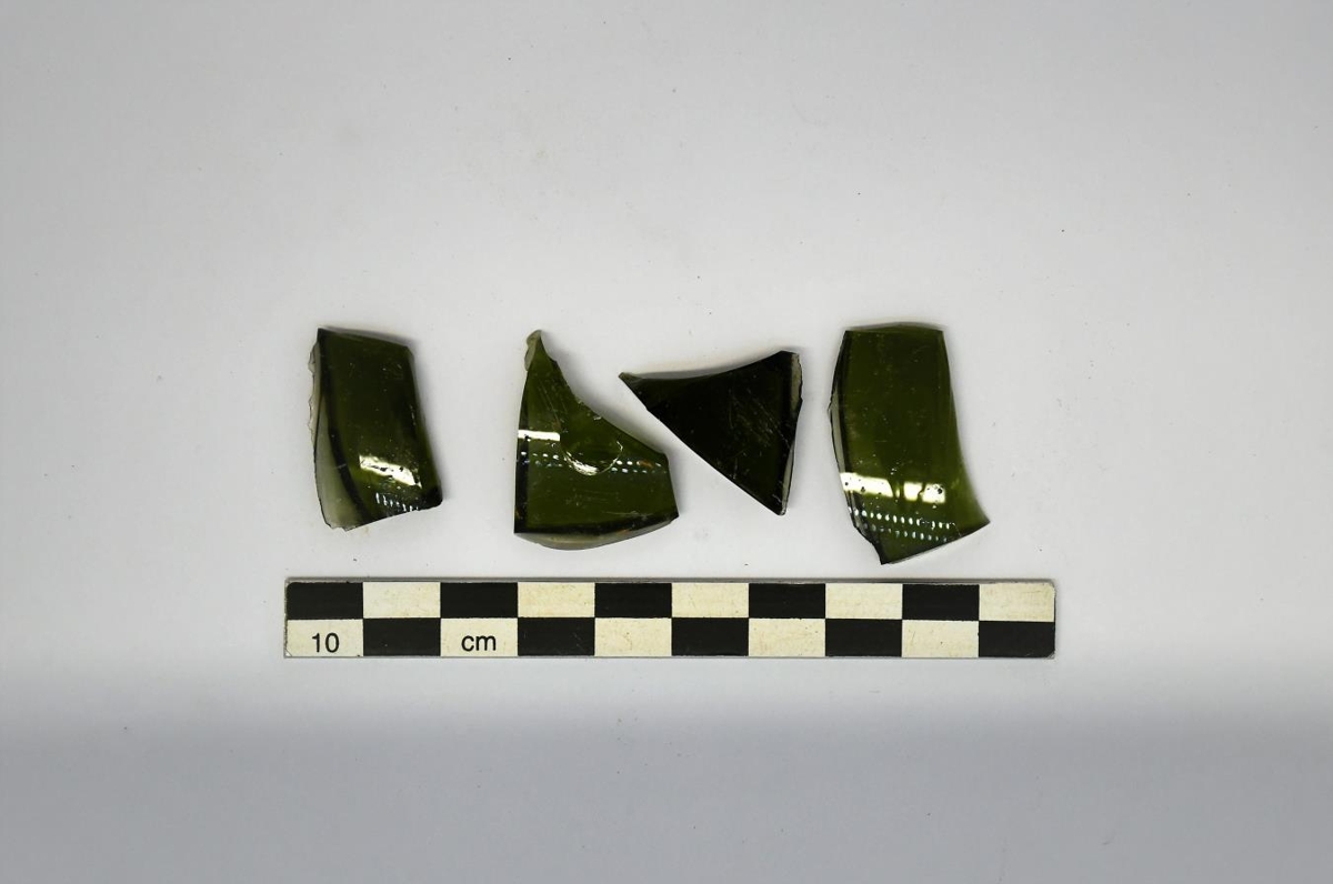 Fjögur dökkgræn glerbrot, líklega brot úr flösku eða öðru íláti.