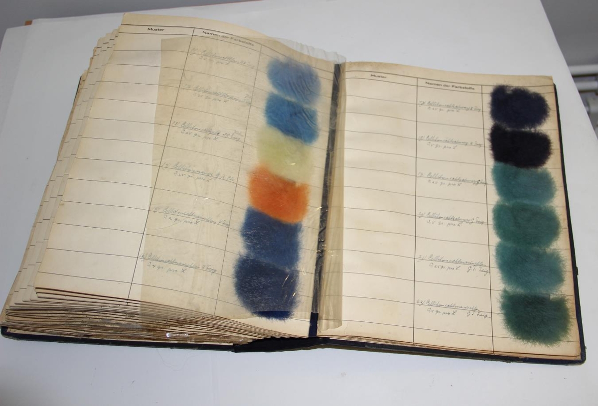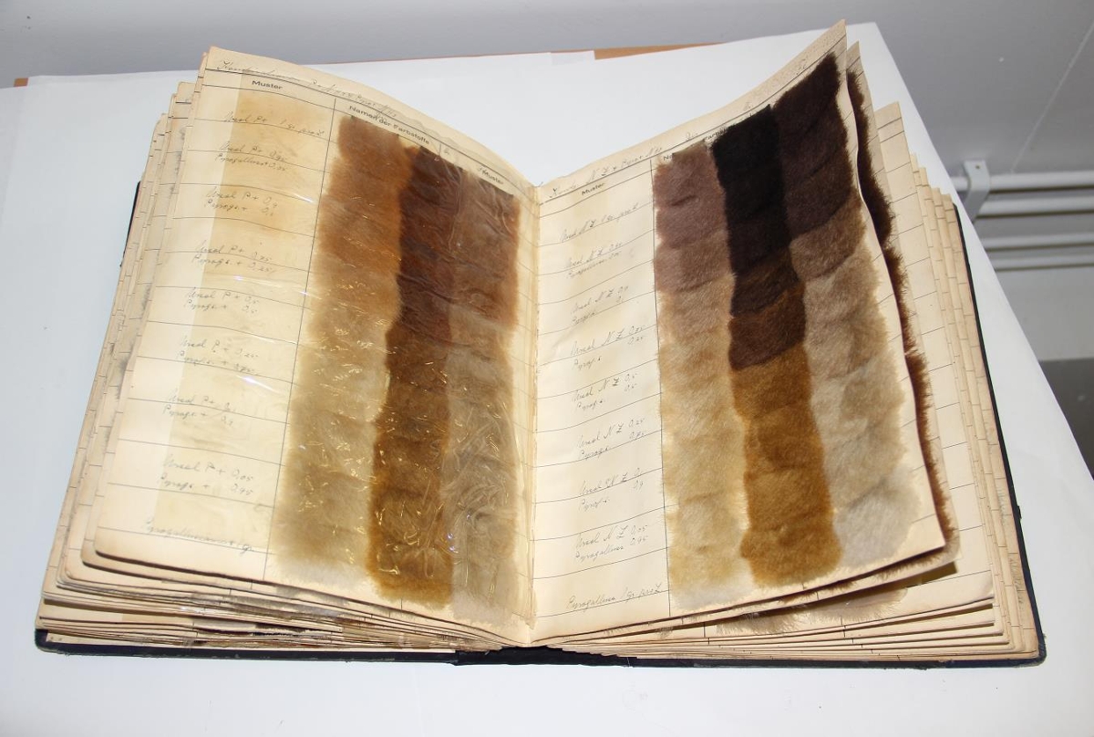 Texti: Þorsteinn Davíðsson Musterbuch. Í bókinni eru hundruð lita og áferðarsýnishorna í loðsútun. Þorsteinn Davíðsson var um áratugaskeið framkvæmdastjóri Skinnaverksmiðjunnar Iðunnar, Skógerðar og Hanskagerðar SÍS á Akureyri.