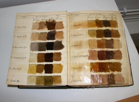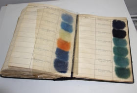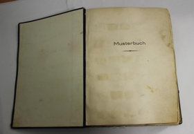 Bókin er munstrabók Þorsteins Davíðssonar frá því hann var við nám í sútun og litun hjá m.a. I.G. Farben árið 1929 í Frankfurt í Þýskalandi.
