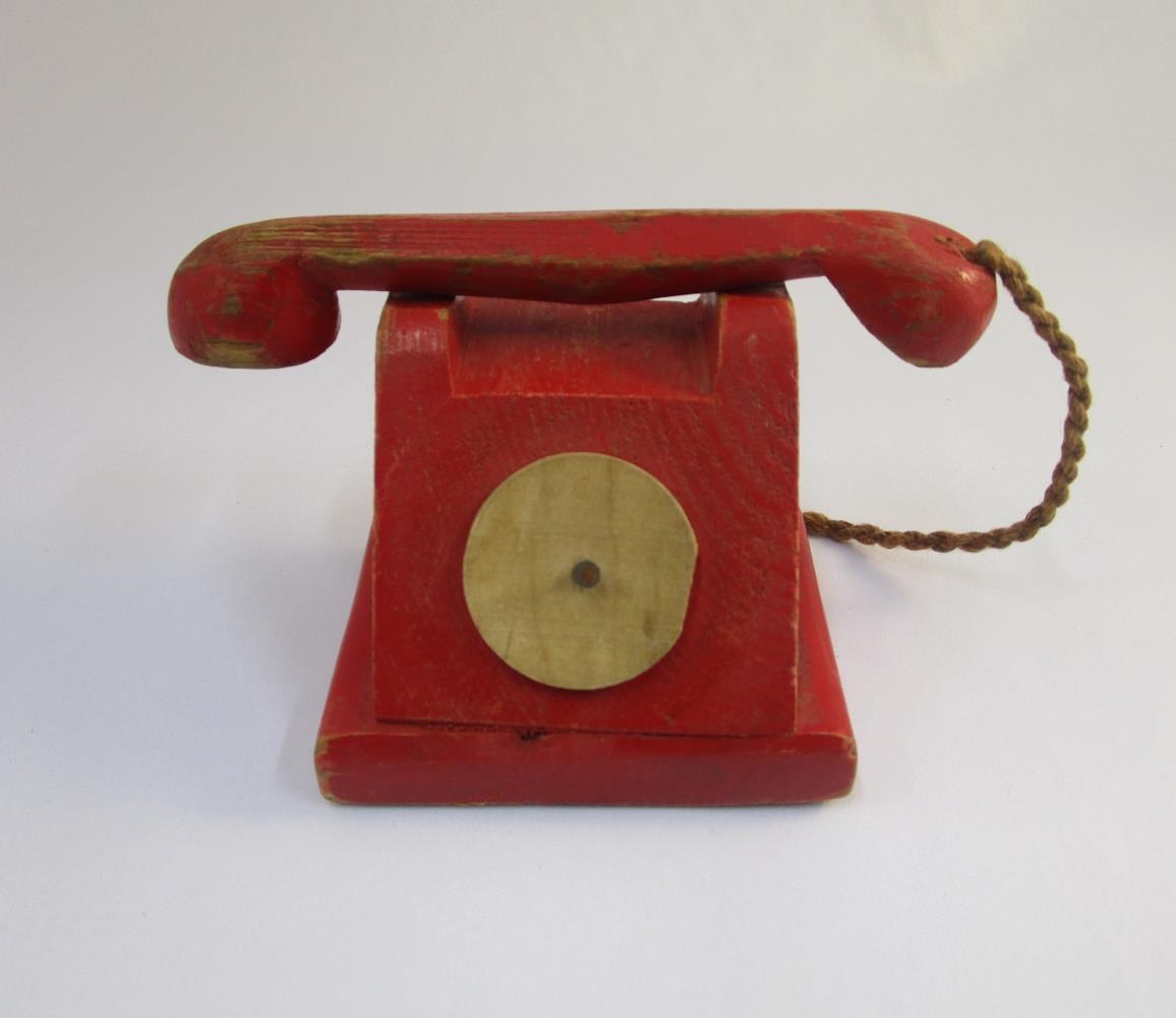 Sími. Rauður leikfangasími með skífu, heimasmíðaður úr viði. Sumarið 2001 afhentu fimm systkini frá Snorrastöðum í Kolbeinsstaðahreppi 60 - 70 ára gömul leikföng sem varðveist höfðu á heimilinu. Flest eru leikföngin heimatilbúin.