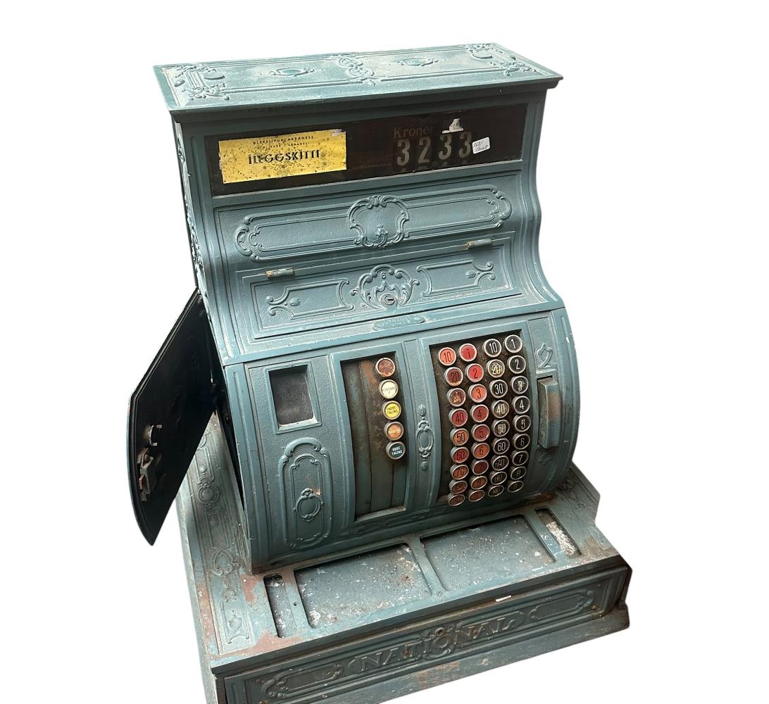 Peningakassi NATIONAL, mjög skrautlegur með upphleiftu mynstri. Blámálaður. Kemur úr eigu Friðjóns Runólfssonar (1896-1971) sem starfræki Glerslípun Akraness h.f. Afhent af eigendum Glerhallarinnar.