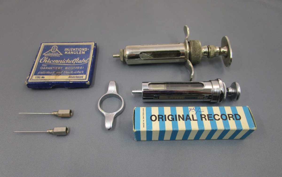 Sprautur og sprautunálar ætlaðar fyrir sauðfé. Ein bólusetningarsprauta (án nálar) merkt Sanitex, made in Switzerland. Hún er úr stáli og gleri, 10 cm löng, tekur 5 ml. og er í upprunalegum kassa sem á stendur: ORIGINAL RECORD. Stálsprauta með glerhylki sem tekur 10 ml.. Hún er 11 cm löng og merkt: PERPENDO. Stór stálsprauta sem tekur 12 ml. Á henni stendur: DURA-VIKING RANFAC BOSTON. Hún er 15 cm löng. Svo er kassi með fimm sprautunálum merktur: INJECTA KLINGENTHAL. INJEKTIONS-KANULEN og tvær stórar sprautunálar merktar HAUPTNER nr.2. Úr búi Höskuldar Pálssonar og Kristínar Níelsdóttur sem bjuggu í Sellátri (Saurlátri) á Breiðafirði árin 1943 - 1945 og síðan í Stykkishólmi.