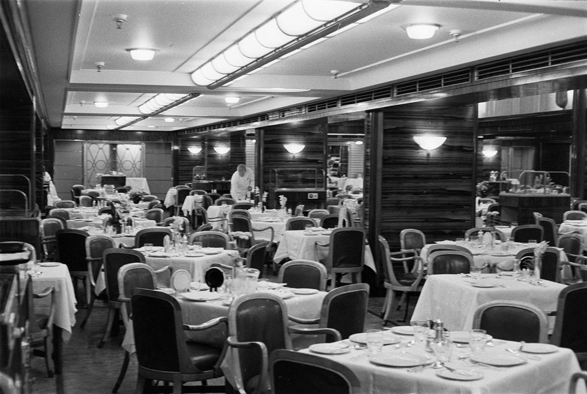 Tekið um borð í farþegaskipi. Veitingasalur. Dúkuð borð, á þeim er borðbúnaður og blóm í vösum. Kokkur að störfum.