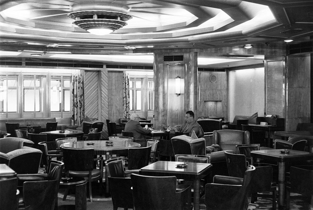 Tekið um borð í farþegaskipi. Salur. Í honum eru borð og stólar. Tveir karlmenn sitja við eitt borðanna og spila á spil.
