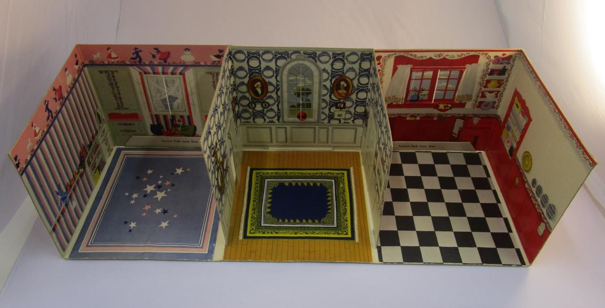 Dúkkuhús í bókarformi. Bókin er harðspjalda og er opnuð til beggja handa og veggir hússins reistir. Í húsinu eru þrjú rými: eldhús, stofa og svefnherbergi. Pappírshúsgögn fylgja í þessar vistarverur og er aðdáunarvert hvað þau eru heil og óskemmd því þau eru mjög fíngerð. Uppsett er húsið 60 cm breitt og 20,5 cm hátt.The FOLD-AWAY DOLL HOUSE and PLAY BOOK of cut-out furniture. Design of rooms by Catherine Barnes. Copyright 1949 by Rudolph J. Gutmann, New York 10. Printed in U.S.A. Patent Pending. Garden City Publishing co. Árið 2001 afhentu fimm systkini frá Snorrastöðum í Kolbeinsstaðahreppi 60 - 70 ára gömul leikföng sem varðveist höfðu á Snorrastaðaheimilinu. Flest eru þau heimatilbúin en þetta dúkkuhús er undantekning.