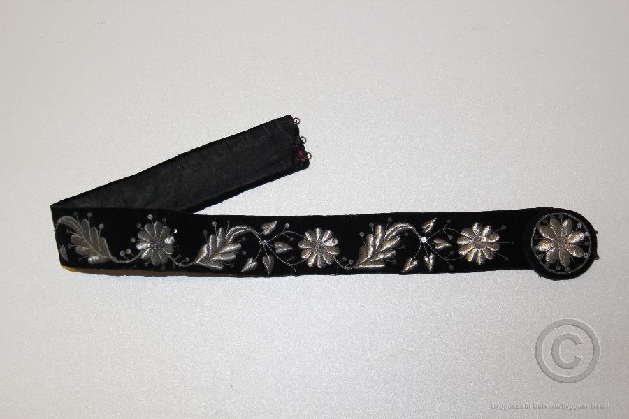 Beltinu er lokað með 3 krókpörum.Ingibjörg Sigurðardóttir saumaði beltið er hún var við nám í Kvennaskólanum í Reykjavík á árunum 1911-1913. Hún var fædd 16.7 1893 og ólst upp hjá foreldrum sínum á Geirmundarstöðum í Sæmundarhlíð í Skagafirði. Hún giftist Árna Hafstað Vík í Skagafirði 1914 og þar áttu þau heima meðan þau lifðu. Ingibjörg dó aðeins 39 ára gömul árið 1932 úr krabbameini. Steinunn, elsta systirinn þá 13 ára eignaðist upphlut móður sinnar og þar með beltið. Árið 1974 gaf síðan Steinunn systur sinni Sigríði, sem er efandi beltisins, beltið þegar hún saumaði sér upphlut.