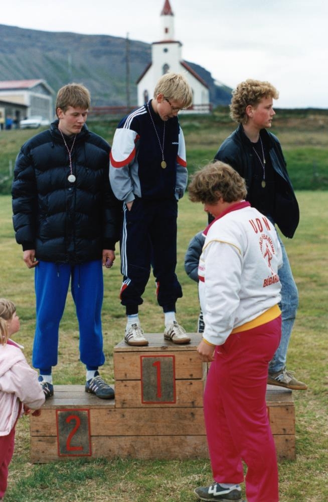 Frá vinstri á pallinum. 2. Óþekktur,1. Ólafur Friðrik Óskarsson Umf. Dögun, 3. Óþekktur.