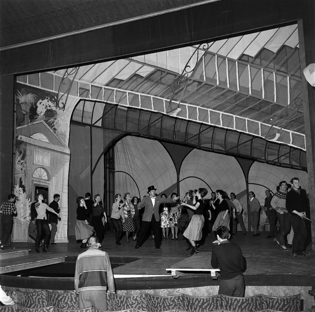 „Æfing á dansatriði í Þjóðleikhúsinu 1962. Veisluatriðið úr My fair lady. Á fremsta bekk er aðstoðarleikstjórinn Benedikt Árnason og til vinstri við hann líklega Sven Aage Larsen leikstjóri. Kór og dansarar í hversdagsfötum. Fyrir miðri mynd er Ævar Kvaran í æfingabúningi.“ (PBB 2019)