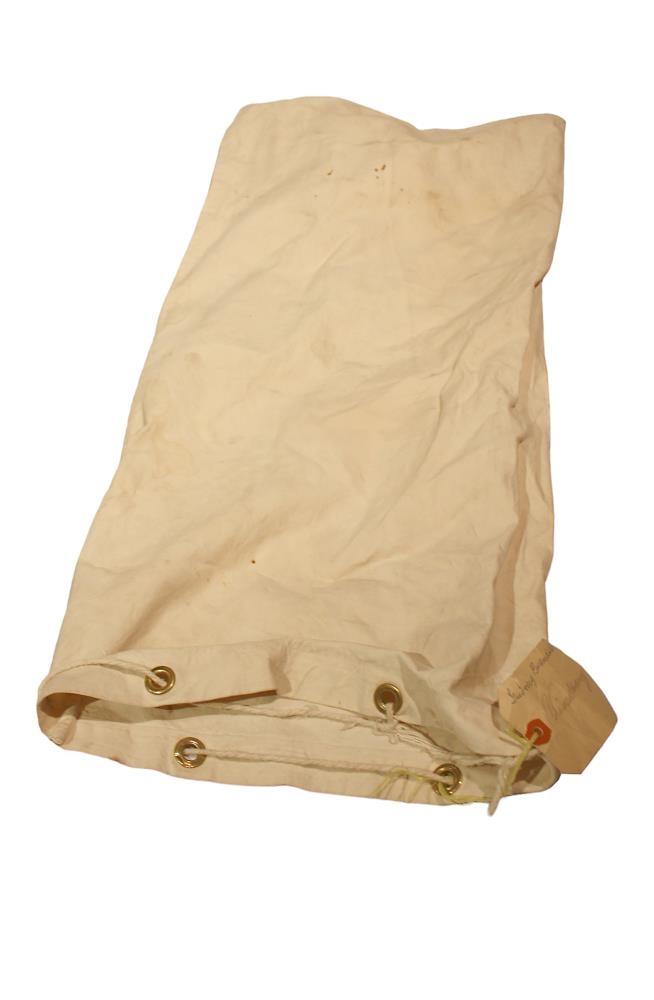 Hvítur poki með fjórum kósum úr málmi. Pokinn var notaður til geymslu fyrir ýmsa hluti í ferðalögum. Óvíst með nákvæman aldur.