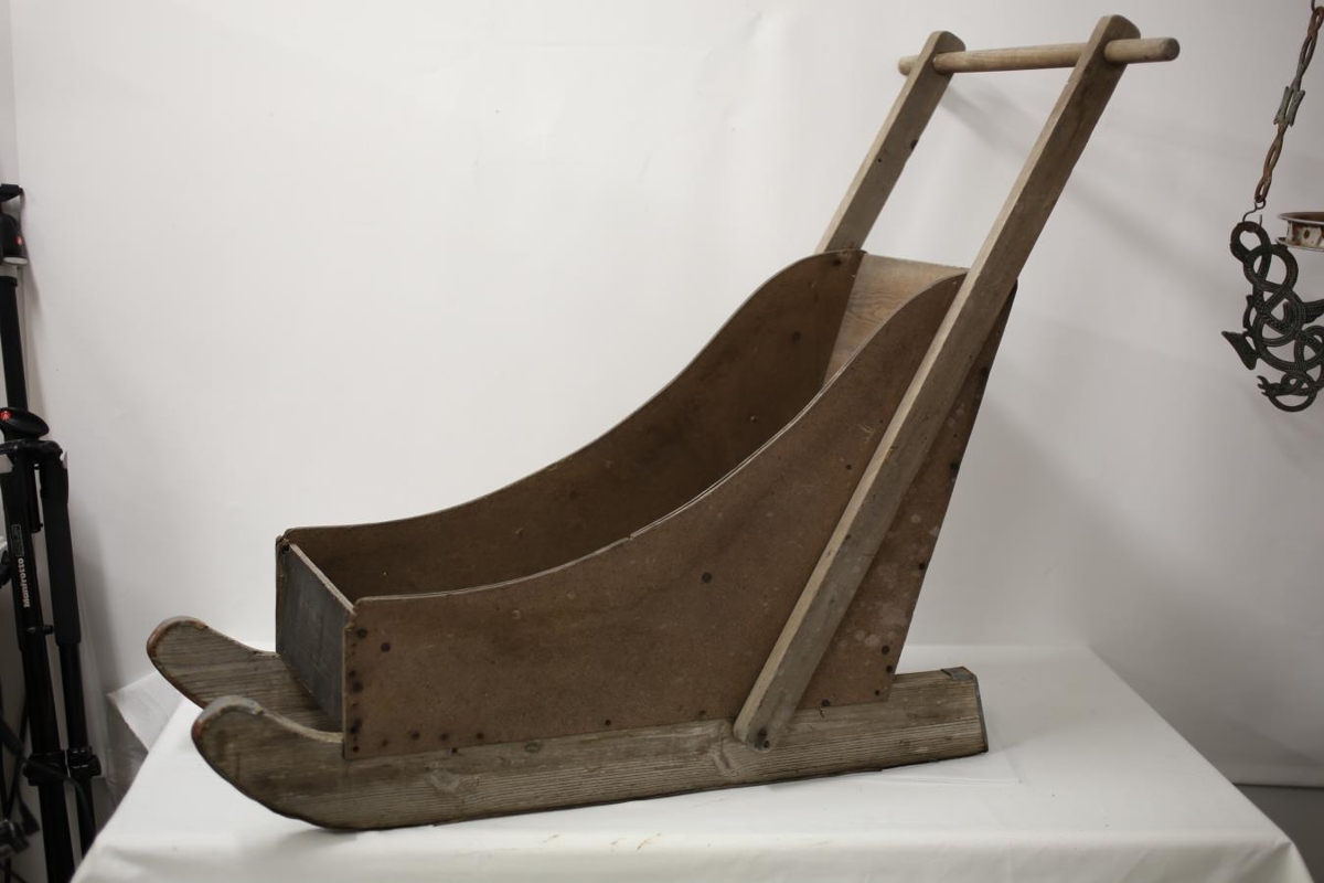 Sleði - snjósleði fyrir barn að sitja í og annað að ýta líkt og skíðasleði. Sleðin er úr við en masonítspjöld eru í hliðum. Sleðin var smíðaður á trésmíðaverkstæði Kaupfélags Héraðsbúa eftir mynd sem frú Friðbjörg Sigurðardóttir kom með úr erlendu blaði. Ekki er vitað hver smíðaði sleðan en hann var smíðaður í kringum 1960
