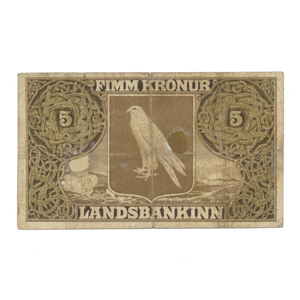 5 krónu ógildur ( gataður ) seðill úr þriðju seðlaröð landsjóðs gefinn út samkvæmt lögum nr. 14 / 18. sept. 1885 um stofnun landsbanka og lögum nr. 2 / 12. jan. 1900 um breyting á lögum um stofnun landsbanka 18. sept.1885 [landsstjórninni heimilað að gefa út seðla fyrir allt að fjórðungi milljónar í viðbót við það sem áður var ákveðið].