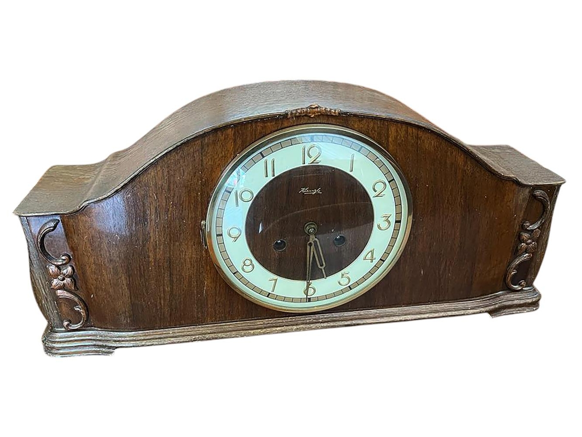 Borðstofuklukka með lítilsháttar útskurði. Kassin er úr eik og litaður dökkbrúnn. Tegund Kienzle klukka made in Germany