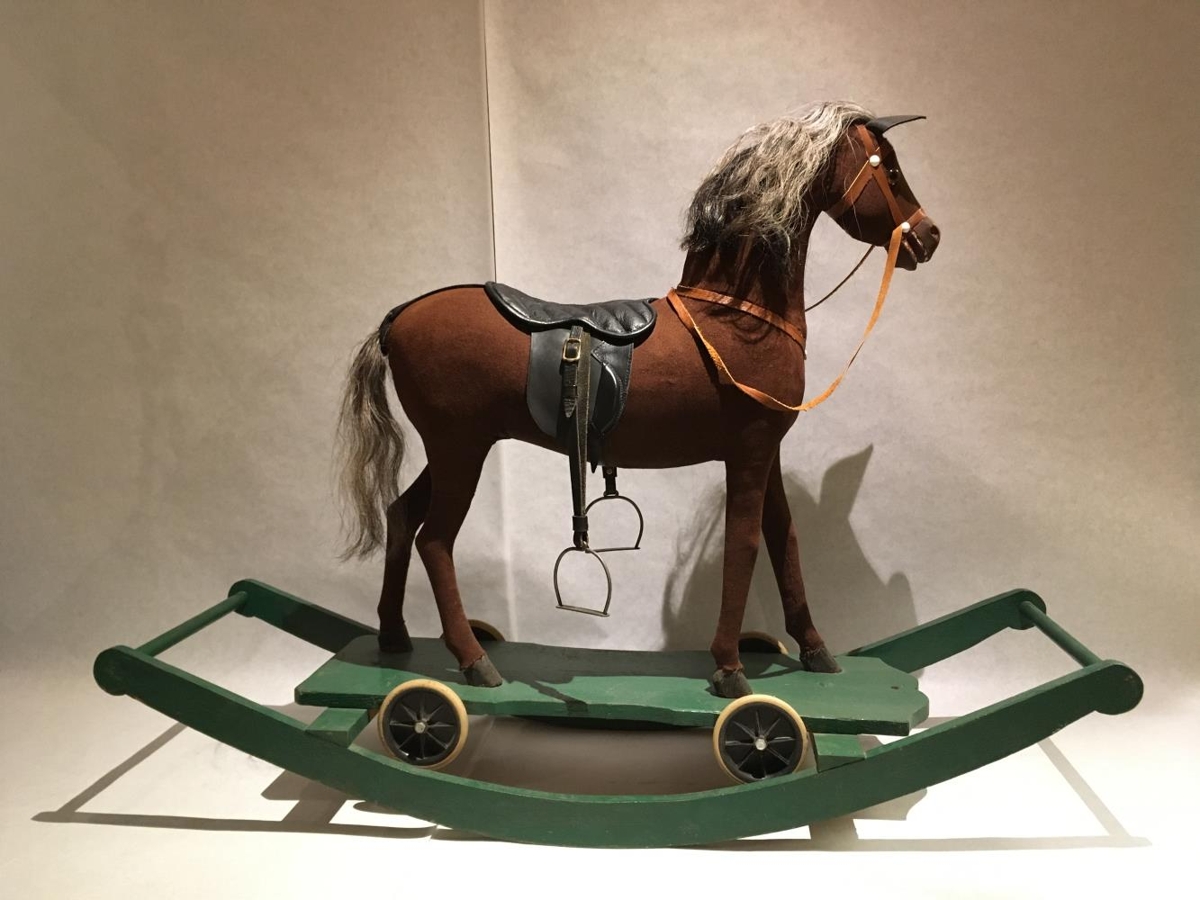 Rugguhesturinn var keyptur í Englandi árið 1929 sem leikfang handa börnum Ingólfs Flygenring og Kristínar Pálsdóttur Flygenring. Hesturinn hefur nokkuð eðlilegt vaxtarlag og fax og tagl úr ekta hrosshári en skrokkurinn þakinn einlitu, brúnu strigaefni. Hann er festur á grænmálaða fjöl, sem þó er auðséð að hefur upphaflega verið rauðmáluð. Hún er 37x88 cm. að stærð og á henni hafa verið fjögur lítil hjól en nú eru aðeins tvö þeirra eftir. Þessu fylgja svo tvær bogasagaðar fjalir, festar saman með þverslám nálægt hvorum enda og með þessum útbúnaði er þetta að sjálfsögðu virkilegur rugguhestur en ekki sé hann aðeins með hjólunum. Mesta hæð hestsins, þ.e. frá fjöl að rótum ennistopps, eru um 80 cm og önnur mál í nokkuð góðu samræmi við það, jafnvel þótt miðað væri við íslenzkan hest. Gefendur eru börn Ingólfs og Kristínar Flygenring.