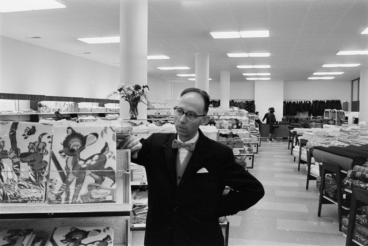 Tekið í verslun. Vefnaðar- og fataverslun. Eigandi Amaro, Skarphéðinn Ásgeirsson, í hinni stórglæsilegu verslun sinni. Tvær konur standa við afgreiðsluborð og fyrir innan það er manneskja að afgreiða þær. Vörur eru í hilllum og rekkum. Blómvendir eru á hillurekkum.