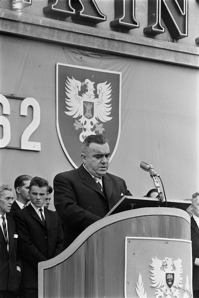 100 ára afmæli Akureyrar, 1962. Tekið á Ráðhústorgi. Uppi á sviði stendur karlmaður í ræðupúlti og flytur ræðu. Aftan við hann standa nokkrir karlmenn.