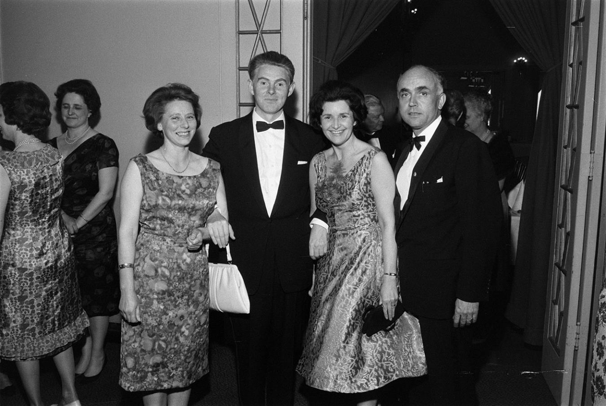 Tveir karlmenn í jakkafötum og tvær konur standa saman. Konurnar eru í kjólum og með veski. Þau standa við inngang að sal og má fólk í salnum. Einnig standa tvær konur til hliðar við þau. Gunnlaugur Þórðarson lögfræðingur til hægri.