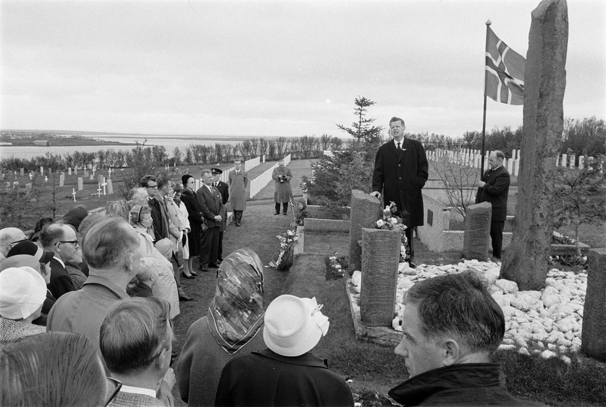 Tekið í Fossvogskirkjugarði við norska minningarreitinn. Minningarreiturinn er með stuðlabersgsgrjóti. Fólk stendur við reitinn. Karlmaður stendur við minnisvarðann og talar til fólksins og hjá honum er blómakrans. Annar maður stendur hjá með fána.
