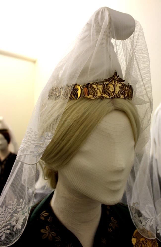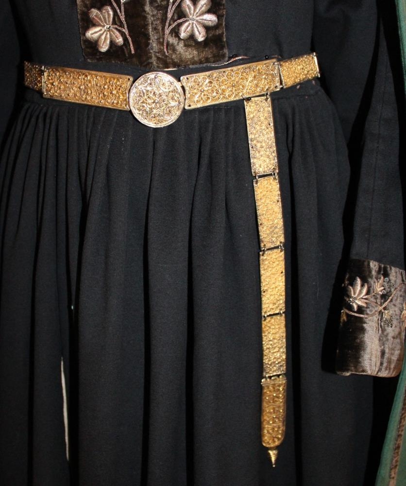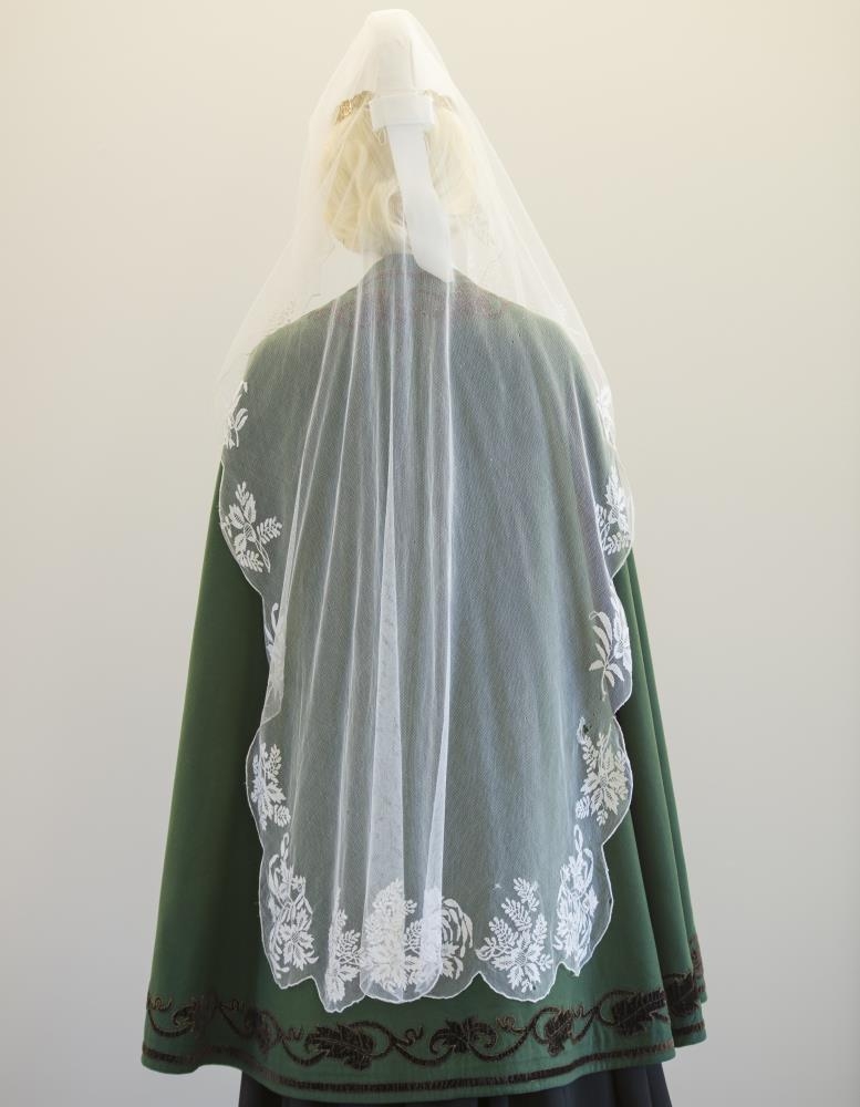 G) Möttull. 100 cm að aftan, 111 cm að framan. Flöskugrænt klæði 6 cm breiður laufabekkur eftir öllum útlínum, næst kanti er þó 1 cm breiður kantur. Allt þetta er "útskorið" (applíkerað) með svörtu flaueli. Allar útlínur og "oðar" munstursins er lagt niðurlögðum gullþræði.