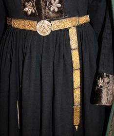 F) Sprotabelti. Gyllt belti. Beltispörin eru þrjú. Kringlótt í miðju en sitthvoru megin eru 8x2,5 stokkur. Í enda sprotans er líka einn slíkur. Þessi eru öll fjögur skreytt með víravirki. Stokkarnir í beltinu eru níu og þau eru stypt. Einnig þau fjögur sem eru í sprotanum. Sprotinn endar í dropa.
