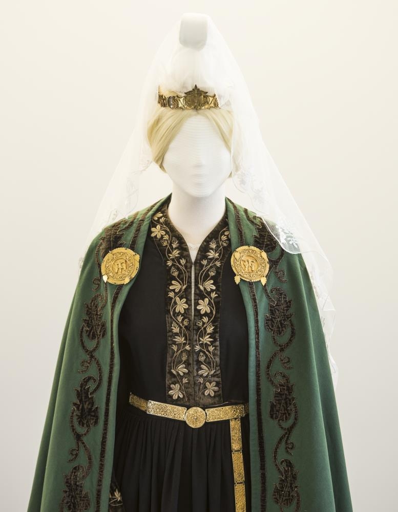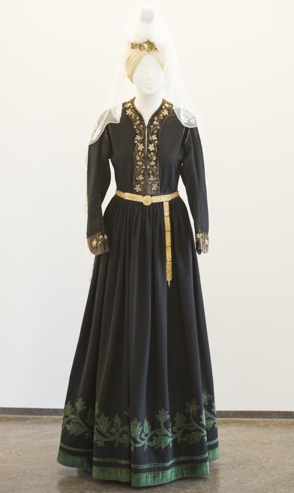 Saga: Talið er að Kristín hafi saumað búninginn í kring um 1870 en þá mun hún hafa setið í festum. Systurnar gáfu búninginn í minningu móður þeirra Kristínar Sigurðardóttur sem var barnabarn Kristínar Jónsdóttur. Kristín Jónsdóttir var fædd á Breiðabólsstað í Vesturhópi 11. apríl 1850.