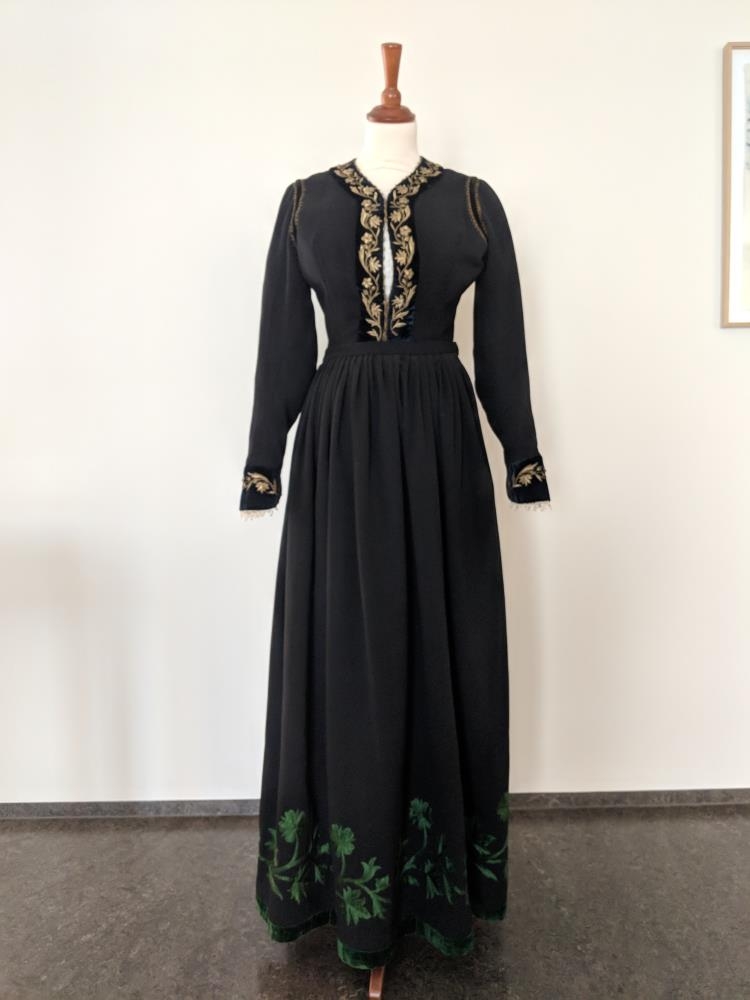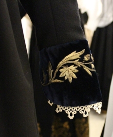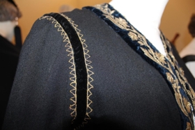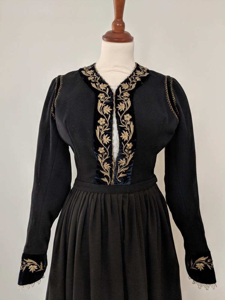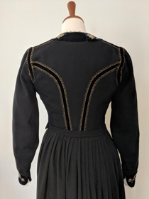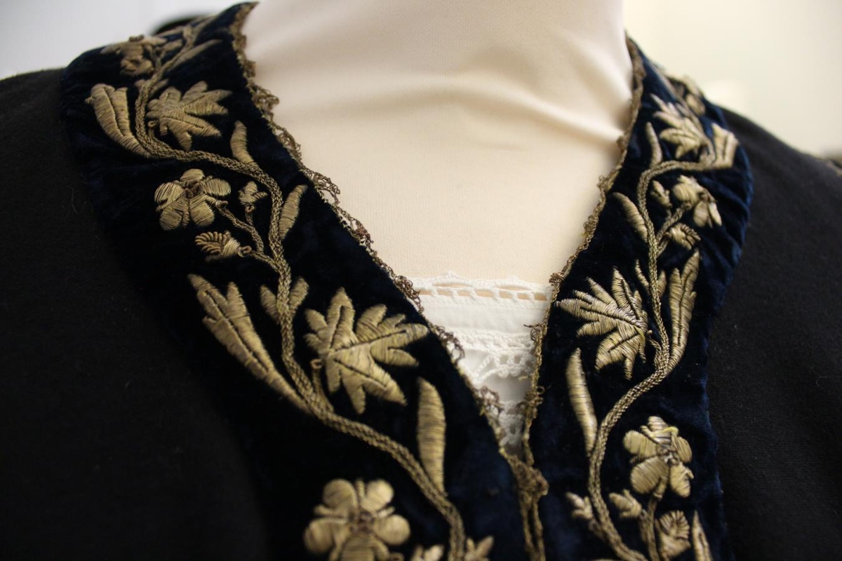 Baldering framan á brjósti og upp að hálsi (ekki aftan á hnakka) og framan á ermum. Knipplaðir borðar úr gullþræði sitt hvoru megin við svarta flauelsborða við axlitr, armhvilft og bak einnig utan um háls og framan með brljósti. Orkeraðar blúndur framan á ermum. Treyjan er klædd að innan og virðist vera nýbúið að fóðra hana með bleiku efni. Ermarnar eru með gömlu rósóttu fóðri úr þunnu efni. Lítur vel út.