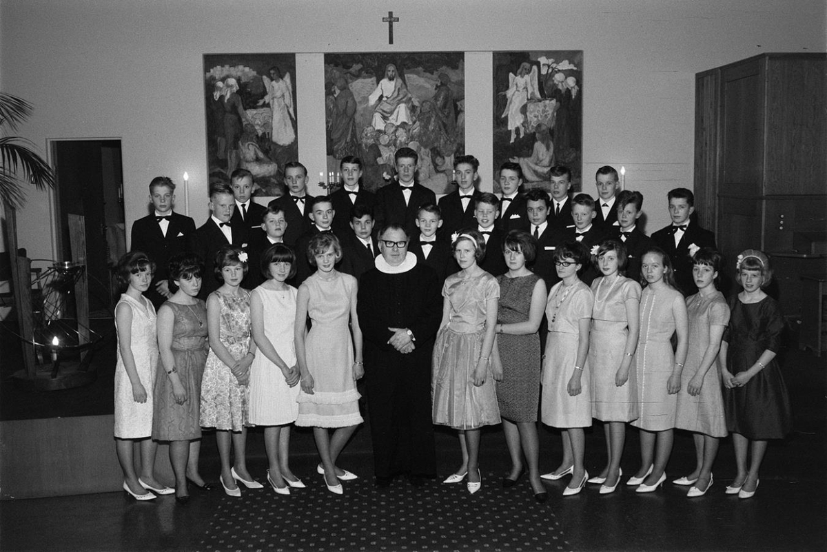 Fermingarbörn stilla sér upp ásamt presti. Stúlkurnar og presturinn eru í fremstu röð og drengirnir eru aftar. Stúlkurnar eru í kjólum en drengirnir í jakkafötum. Aftan við þau eru myndir.