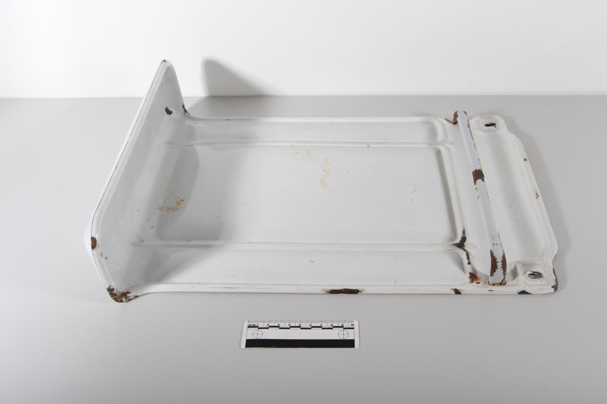 Emaljéraður sleifarekki, 48 cm á hæð, 34,5 cm breiður þar sem hann er breiðastur. Tvö göt eru efst í hornunum, þar sem hann er hengdur upp. Rétt fyrir neðan götin er slá sem sleifarnar eru hengdar á. Sláin er skellótt af notkun. Neðst er eins konar skál sem grípur dropa sem drjúpa af sleifunum, og er rekkinn dýpstur við þann enda, eða 9,5 cm.