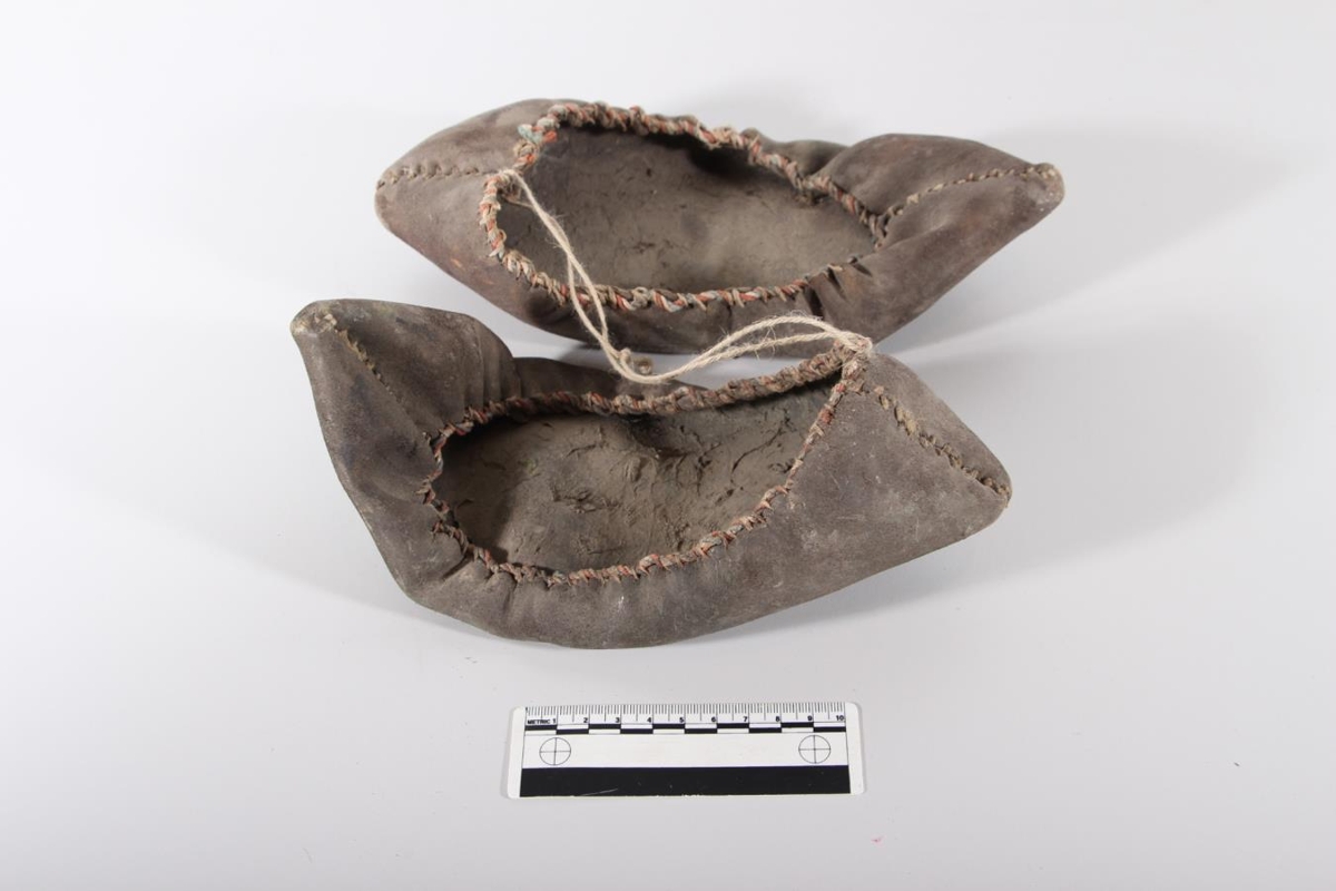Skinnskór úr kýrhúð, 26 cm langir, 12 cm breiðir. Skórnir eru harnaðir og skorpnir og annar samanherptur. Skórnir eru fremur groddalegir, saumaðir saman á hælum og fyrir miðju ofan við tær með grófu bandi, sennilega úr hampi. Jaðrarnir þar sem skórnir eru dregnir saman utan um fótinn eru saumaðir með snúnu hampsnæri í þremur litum; hvítu, rauðu og bláu.