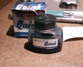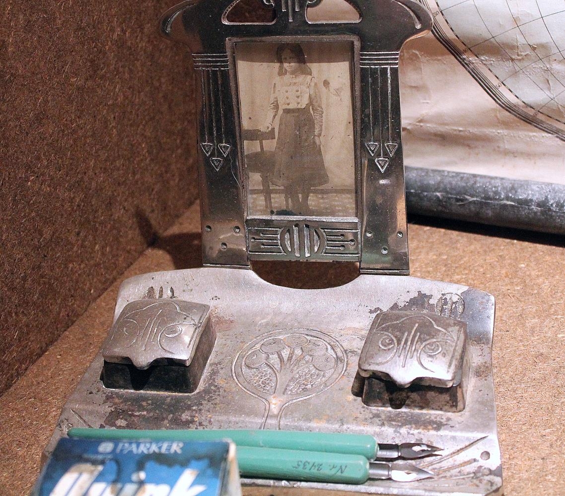 Blekbytta og pennastatív úr eigu Sigurðar Þórólfssonar (1869 - 1929), skólastjóra Hvítárbakkaskóla, en hann var faðir gefanda. Á byttunni er mynd af dóttur Sigurðar, Kristínu Lovísu (1898 - 1970), þá 12 ára. [Kristín var ein af fyrstu konum sem kjörnar voru á þing, var landskjörinn alþm. fyrir Sjálfstæðisflokkinn 1949-53.] Gef. Margrét Sigurðardóttir (1914 - 2002).
