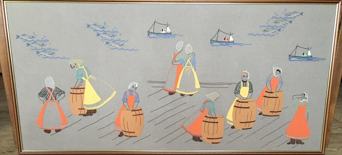 Útsaumsmynd af af síldarbátum og síldarstúlkum að salta síld á plani. Myndina saumaði Helga Stella Jóhannesdóttir á fimmta áratugnum, líklega milli 1945-1948. Helga gaf tengdasyni sínum Jakobi Jakobssyni fiskifræðingi myndina og var það veggprýði á heimili hjónanna Jakobs og Margrétar Elísabetar Jónsdóttur í áratugi.
