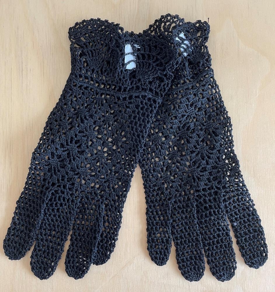 Svartir heklaðir peysufata hanskar með munstri á handarbaki og breið blúnda við úlnlið.