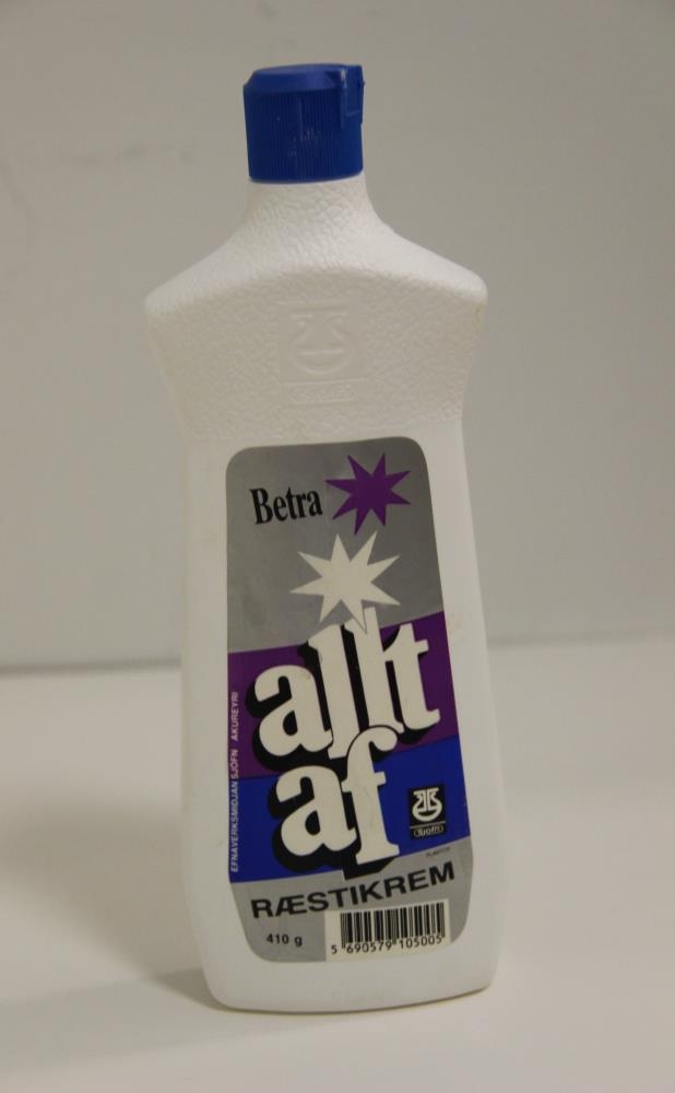 Hvít plastflaska með bláum plasttappa, smelltu loki og sprautustút. Sjafnarmerkið upphleypt efst á framhlið. Álímdur miði í mörgum litum. Áletrun: Betra „allt af“ ræstikrem - 410 g - Sjafnarmerkið - Efnaverksmiðjan Sjöfn, Akureyri (Nafnið Plastos, sem mun vera framleiðandi flöskunnar). Allt af ræstikrem mun hafa verið með fyrstu íslensku framleiðsluvörum þessarar tegundar. Aðallega höfðu verið á markaði erlendar tegundir í duftformi. Nafnið „allt af“ var mjög vel heppnað og gott til auglýsinga, enda sala vörunnar strax í upphafi mjög góð.