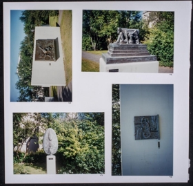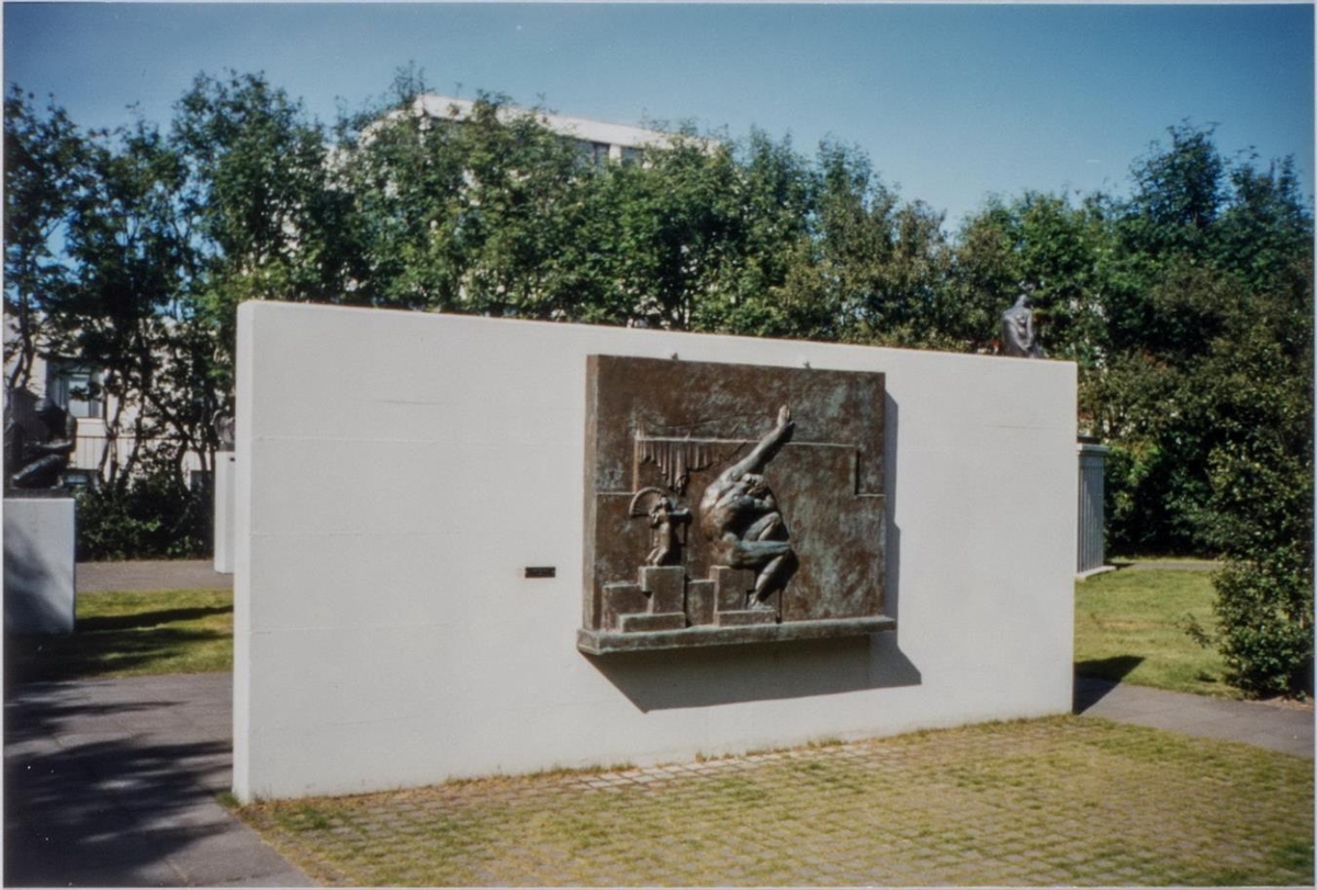 Maður situr á stalli og syrgir konu sem virðist liggja á bekk. Klæði (líkklæði?) iggur fram af bekknum. Á öðrum stalli er par í dansi. Verkið er á steyptum vegg. Aftan við það má sjá tré og hús.