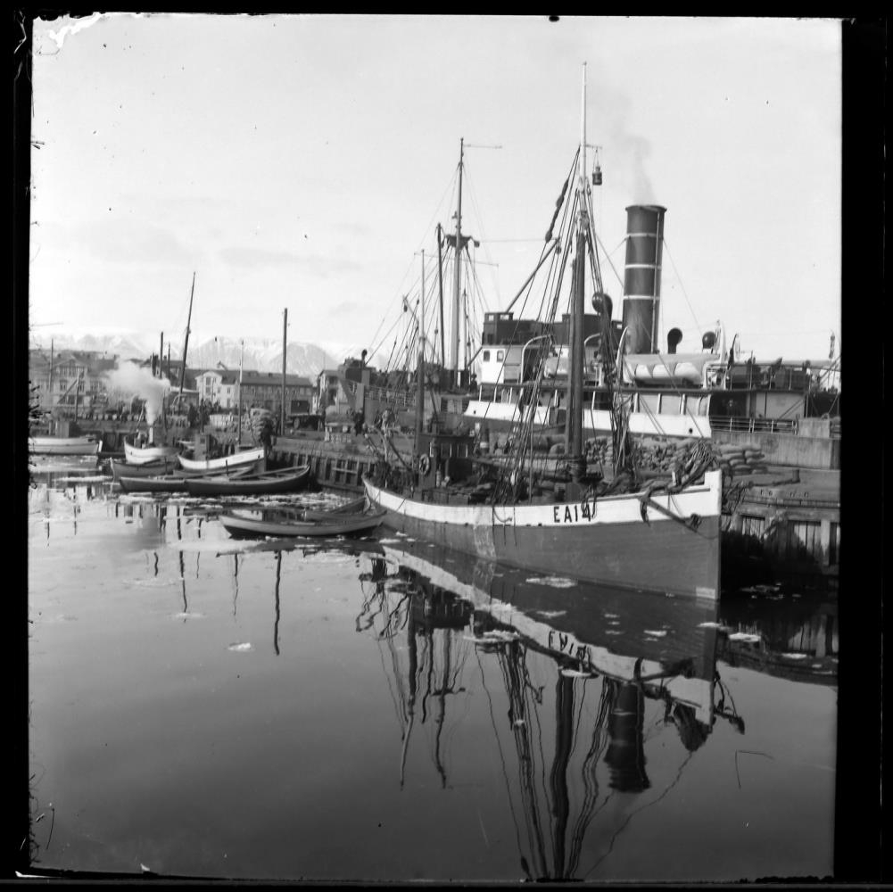 „EA 14 hét VÍKINGUR. Þetta var gömul hákarlaskúta byggð á Akureyri 1871 en endurbyggð sem vélskip 1917. (Sjá Íslensk skip 1, bls. 147). Bátrurinn var síðast gerður út 1929. Gufuskipið bak við hann er millilandaskip Bergenska Gufuskipafélagsins (BDS) LYRA, sem hóf ferðir hingað 1925. Myndin er því frá árunum 1925-1932 þegar VÍKINGUR var dæmdur ónýtur, en líklegast 1925-29. Sama gildir um mynd BB2-81b.“ (BÞ 2018)