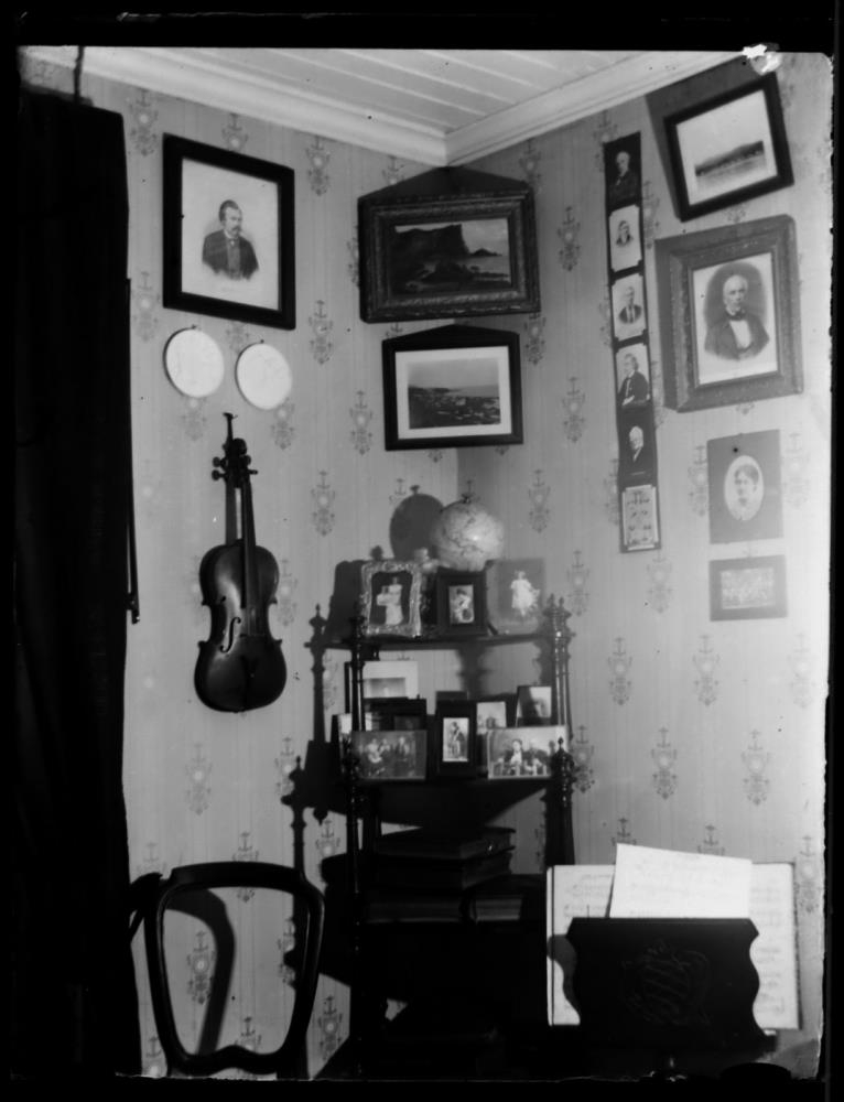 „Á myndinni sem er neðst til hægri á hillunni sýnist mér vera hjónin Guðlaug Eiríksdóttir Wium (1873-1962) og Snorri Gíslason Wium (1851-1898).“ (SBBP 2022)