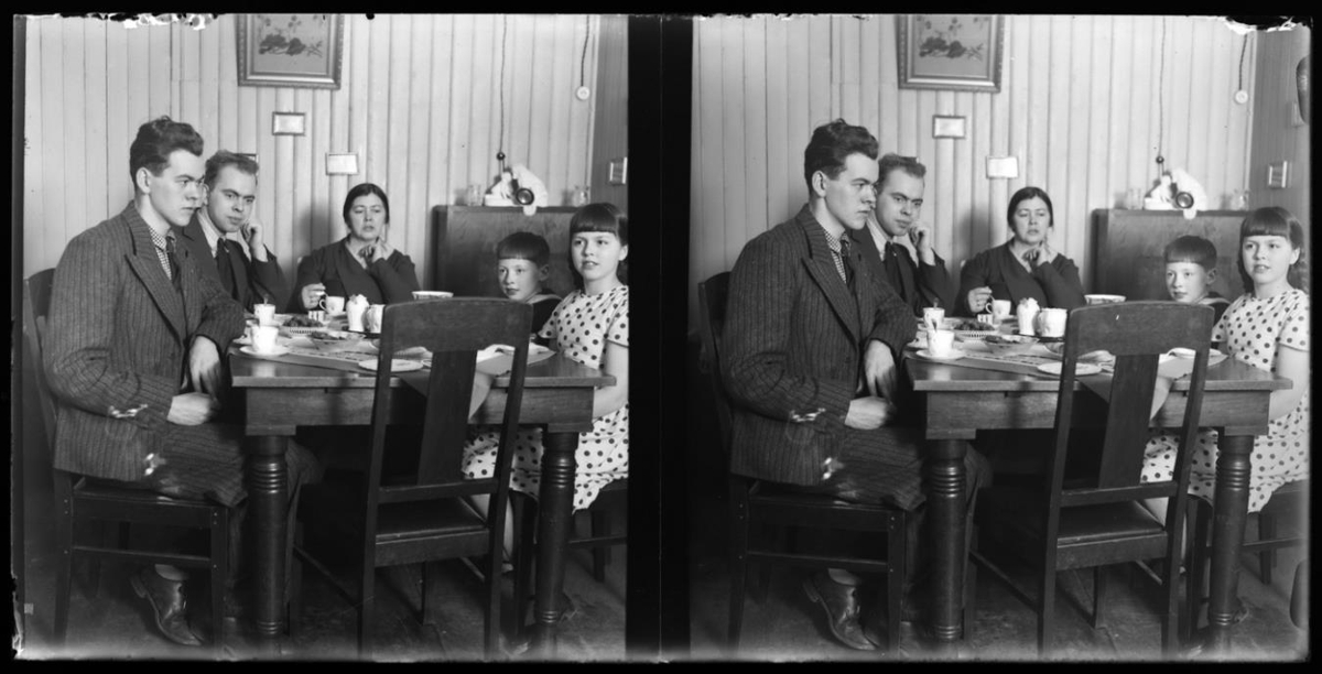 Á heimili B.B. Og Málfríðar eiginkonu hans Bakka Norðfirði. K.M.A. Ásamt börnum þeirra hjóna: Björn, Jóhanna, Ari, Steinarr 1934. Steríóskóp, aðskyldar.
