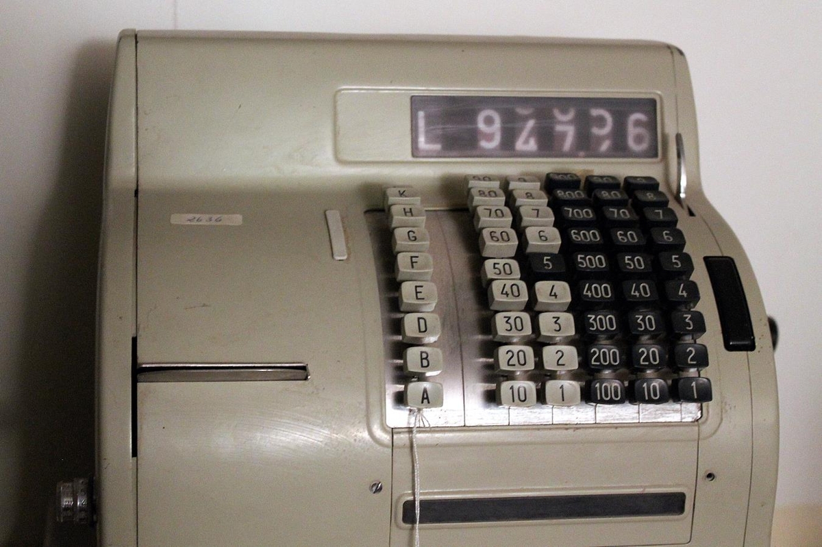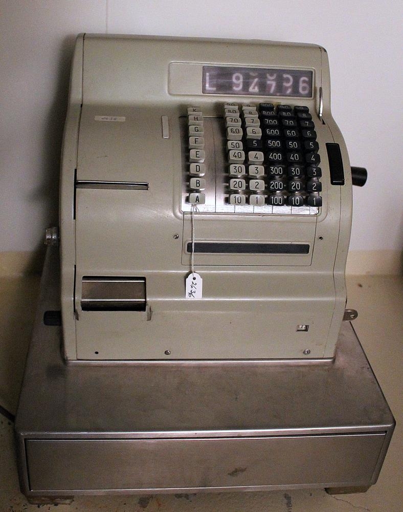Búðarkassi (sjóðvél) frá Kaupfélagi Borgfirðinga. Gerð: Hugin.