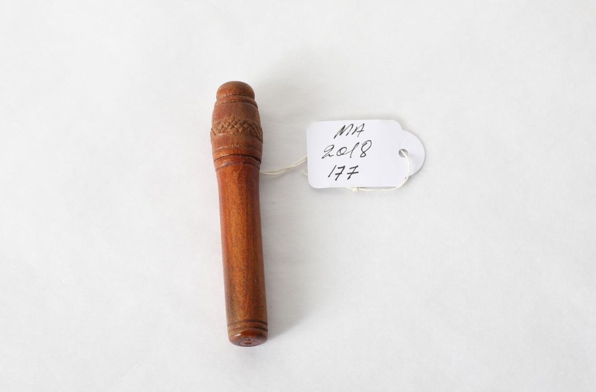 Lítið og nett nálhús rent úr harðvið og er með skrúfuðu loki og á því er smá útskurður. Inni í því eru mjög fínar og grannar saumnálar Nálhúsið er óvenju lítið og fallega unnið. Var í eigu Maríu Einarsd. á Sturluflöt og var með dótinu sem er í málmboxinu sem hefur no MA 2018-176.